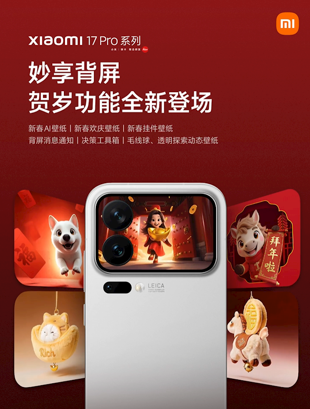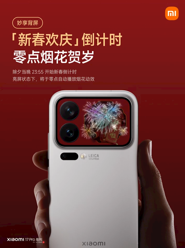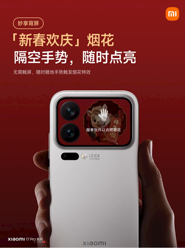 快科技2月10日消息,今日,小米手机宣布,小米17 Pro系列妙享背屏新春贺岁功能上线,带来多款新春主题壁纸、跨年倒计时烟花以及多种日常趣味玩法。